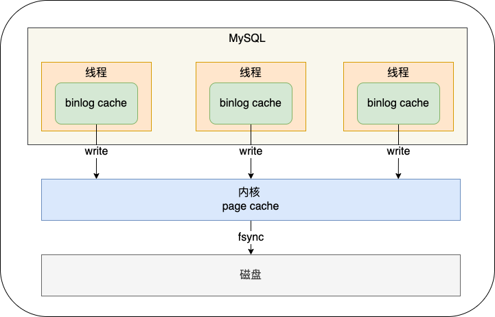 write, 把 binlog cache 写到 binlog 文件, 并清空 binlog cache; 此时并没有持久化到磁盘, 因为数据还缓存在文件系统的 page cache; 这个步骤不涉及磁盘I/O - 执行图里的