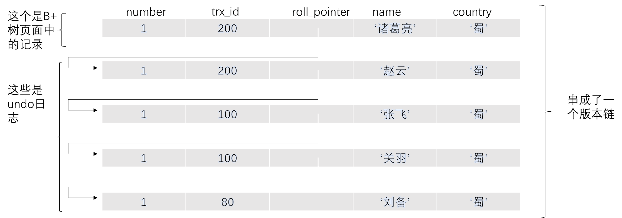 一条记录的每一次更新操作产生的 undo log 格式都有一个 roll_pointer 指针和一个 trx_id 事务id: